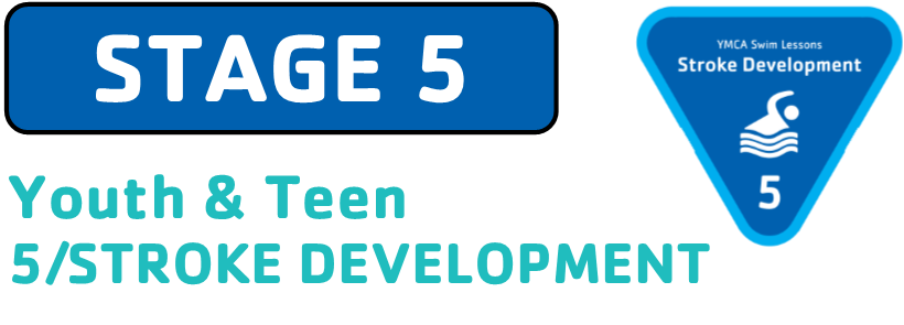 Students in stage 5 work on stroke technique and learn all major competitive strokes. The emphasis on water safety continues through treading water and sidestroke.